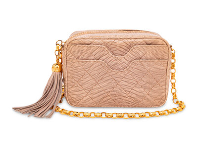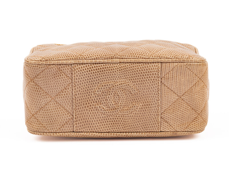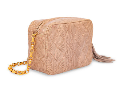 Camera shoulder bag in quilted tan lizard skin with gold-tone hardware. Zipper closure with leather tassel zipper pull and metal chain strap.