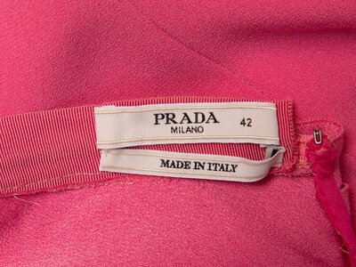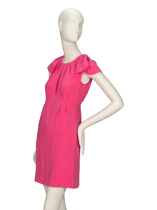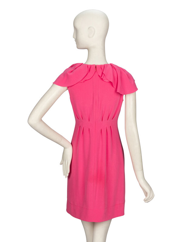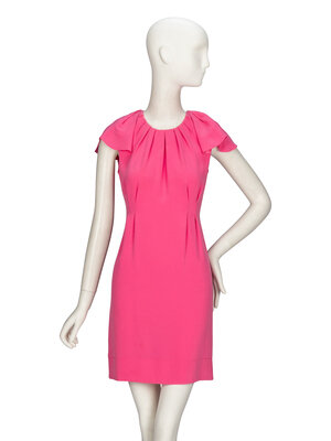 Sheath dress in bubblegum pink satin-back crêpe. Slight stretch to fabric. Round neckline with radiating pleats. Open armholes with flutter cap sleeves. Box pleats at waist. Above-knee-length straight skirt. Invisible zipper closure at back. Unlined.