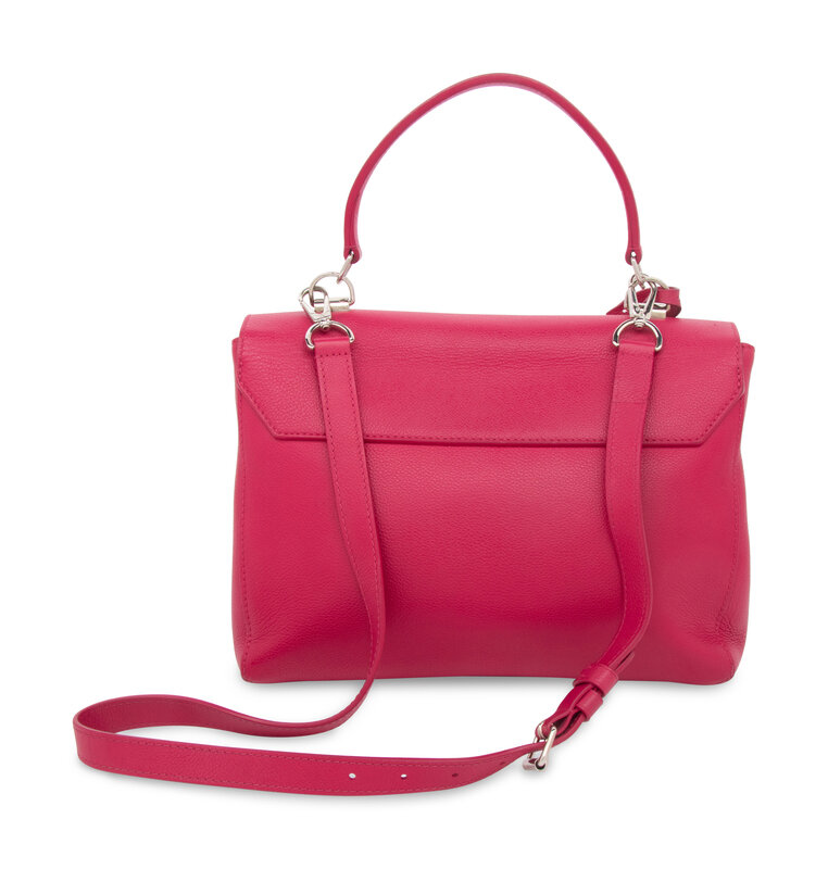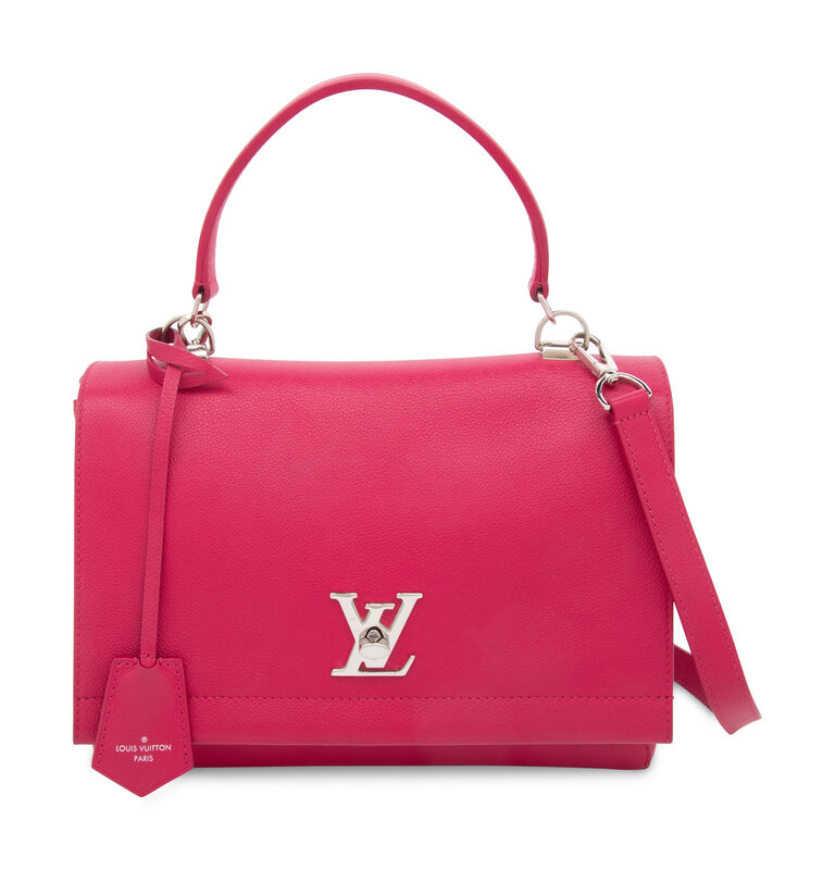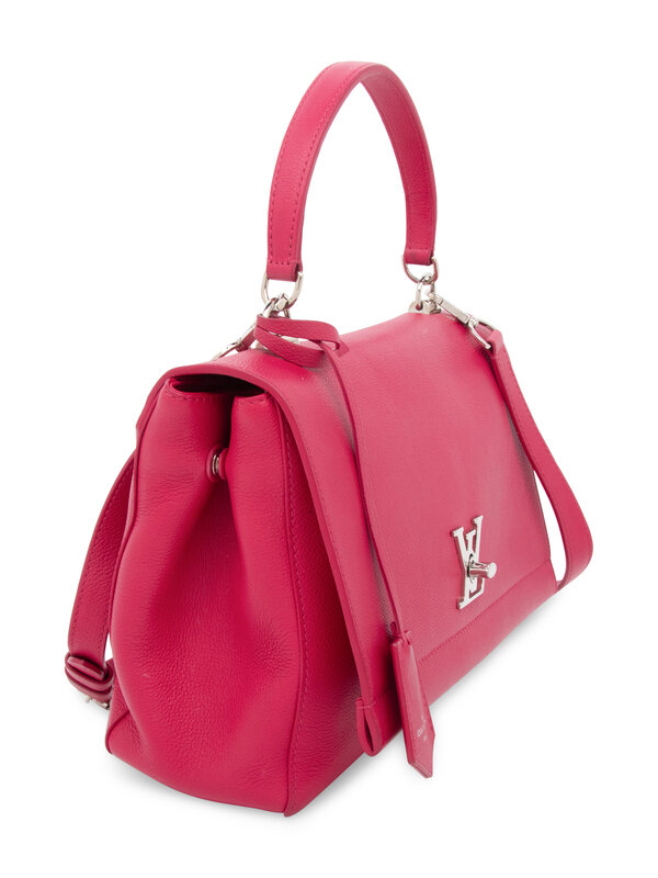 Lockme II handbag in "dahlia" magenta pebbled calfskin leather with silver-tone hardware. LV turn-lock closure, flat leather handle, and removable & adjustable flat leather shoulder strap.