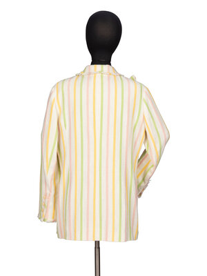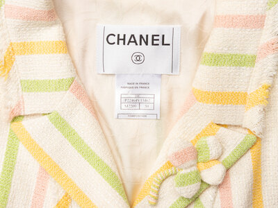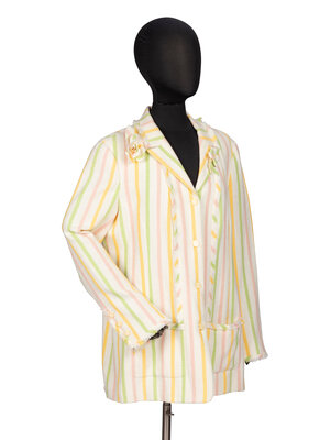 Long jacket in white & pastel multicolor-striped cotton-blend tweed. Notched & peaked lapels. Button closures at front. Full-length sleeves with working button closures at cuffs. Fringed trim throughout. Two patch pockets at front. Two removable self-fabric pins at lapels. Button closures at front. Chain at interior hem. Fully lined.