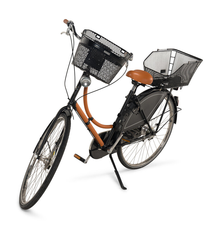 Includes additional removable woven leather & wire basket, removable elastic components, and collapsible bike lock with keys.