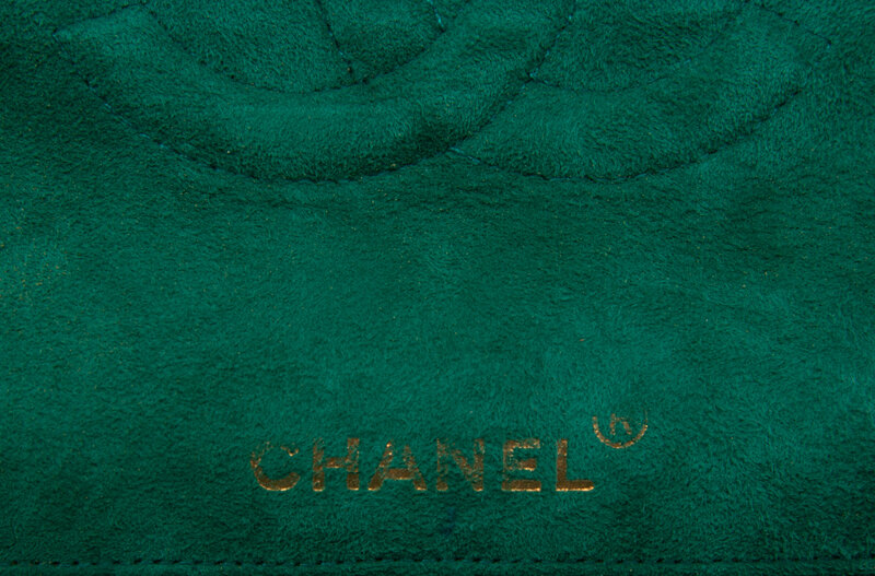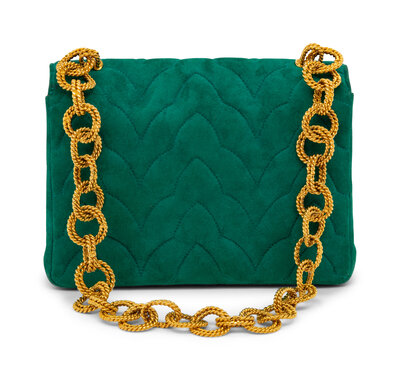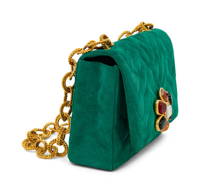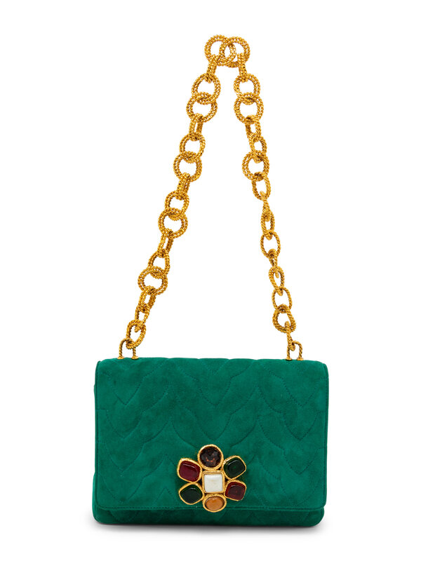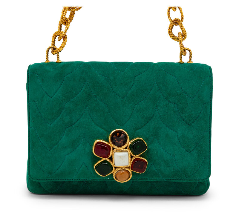 Flap bag in quilted emerald green suede; features 24k gold-plated Gripoix pâte de verre detail at flap. Magnetic snap closure and gold-plated chain-link strap.