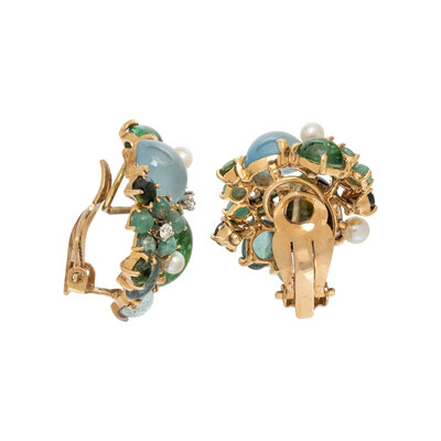 Variously shaped green tourmaline, aquamarine, emerald, and moonstone, with seed pearls and round diamonds. 14 karat yellow gold. 1 1/4 x 1 inches.
