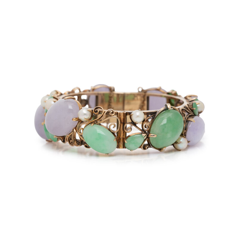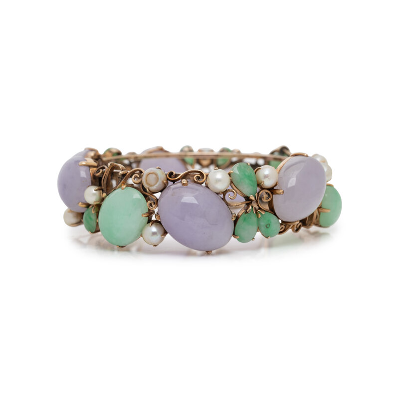 Variously shaped cabochon green and lavender jade and cultured pearls, hinged with side clasp. 14 karat yellow gold. 6 3/4 inches inner circumference.