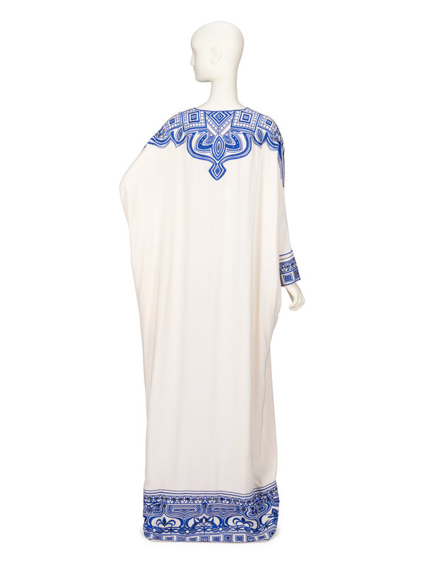 Kaftan in white silk crêpe de chine with cobalt blue embroidery and cutwork throughout. V neckline. Full-length incorporated dolman sleeves. Two in-seam pockets at side seams. Unlined.