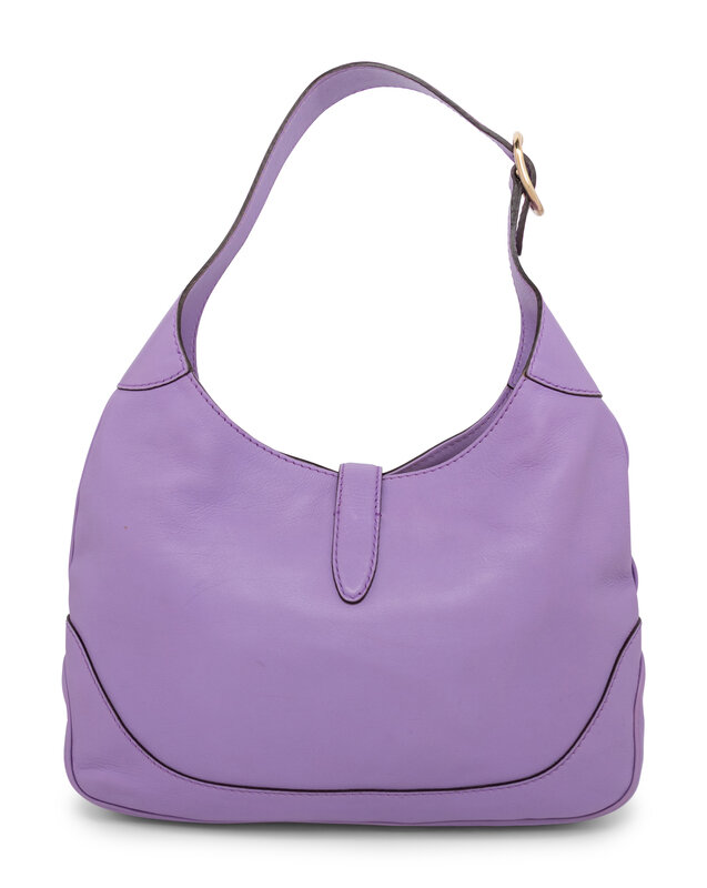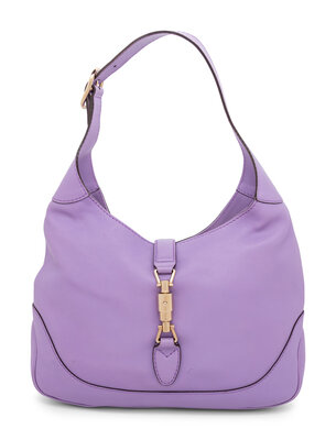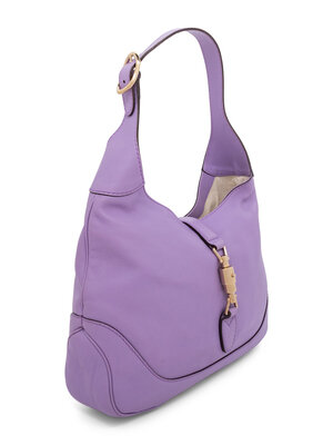 Large Jackie bag in lilac calfskin leather with light gold-tone hardware. Push-look hook closure, adjustable flat leather handle.