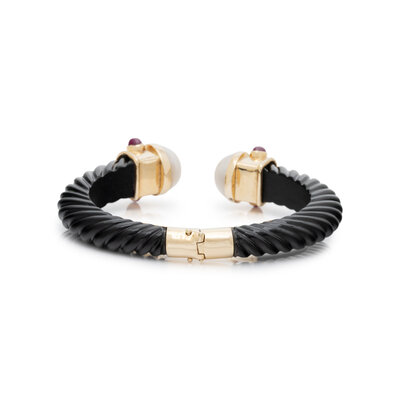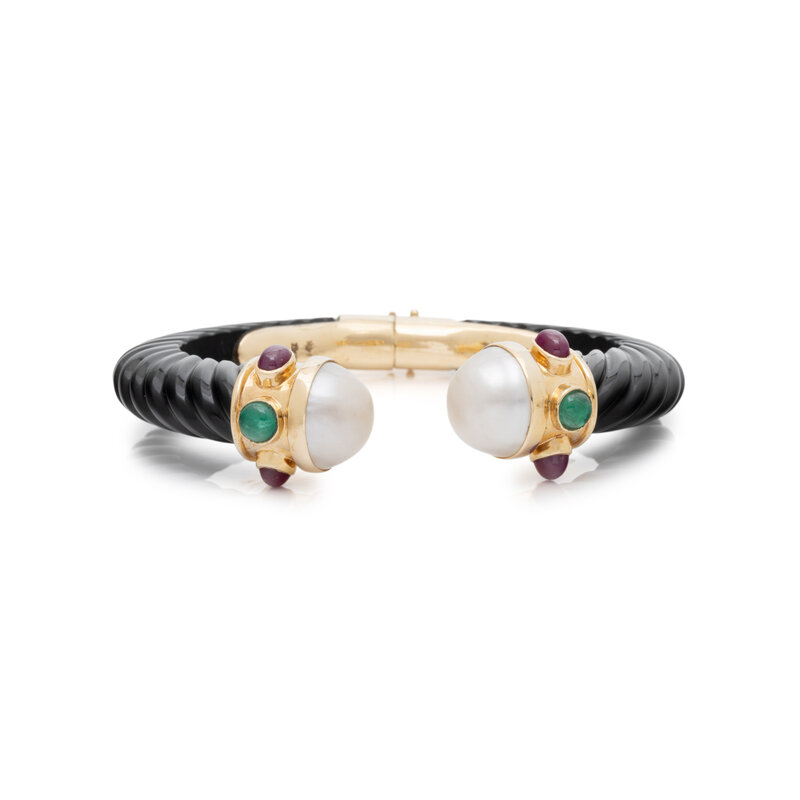 Carved black onyx with mabé pearl finials measuring approximately 14.00 mm, and oval cabochon rubies and round cabochon emeralds, hinged at the back. 18 karat yellow gold. 6 1/4 inches inner circumference.