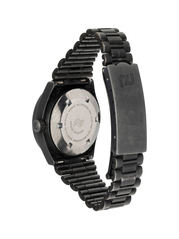 Stamps: Case back: PORSCHE DESIGN SWISS MADE 7050 S WATER RESISTANT TESTTED 10 ATM AUTOMATIC INDABLOC ALL STAINLESS STEEL. Case back interior: ORFINA WATCH LTD SWISS. Movement: ORFINA WATCH LTD TWENTYFIVE 25 JEWELS SWISS MADE.
