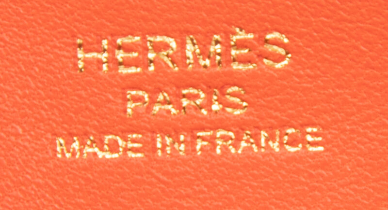 Additional Information: Gold-plated hardware; zipper closure; orange lambskin lining; one main compartment with interior sidewall pocket; protective feet at base.