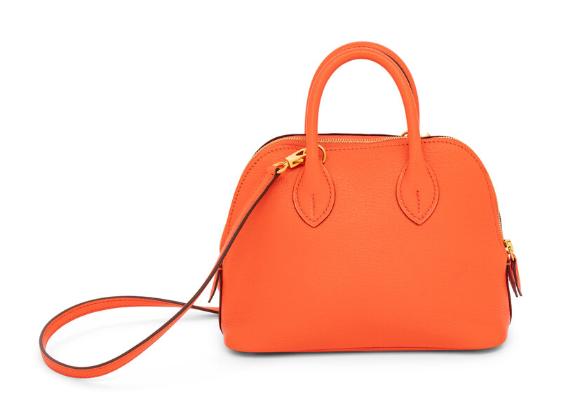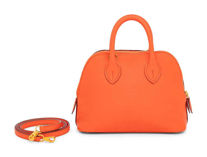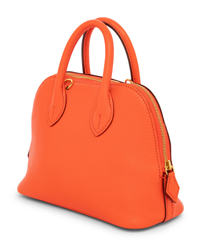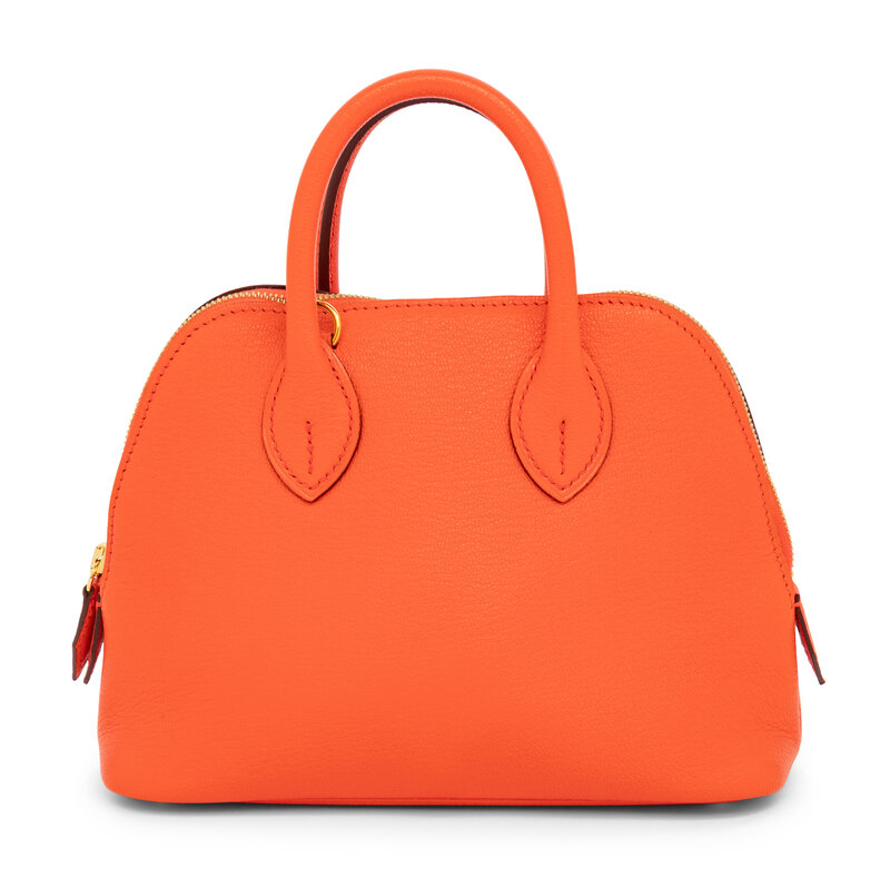Mini Bolide handbag in Chevre goatskin leather in Feu orange. With gold-plated hardware, rolled handles, and removable shoulder strap.