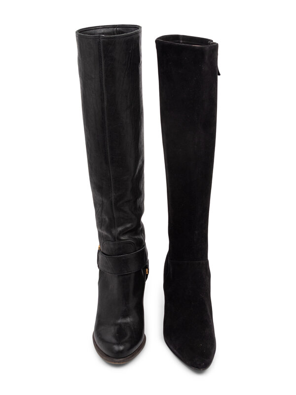 Knee-high heeled boots in black suede. Zipper closure at side.