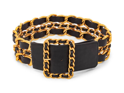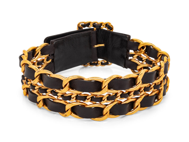 Belt in gold-tone metal and black leather; with interwoven chain & leather details.