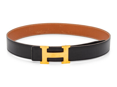 Constance belt in black Box leather with a brown Epsom leather. With interchangeable Constance "H" buckle in gold-plated metal; stamped Hermès.