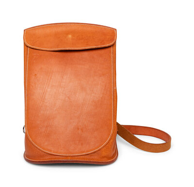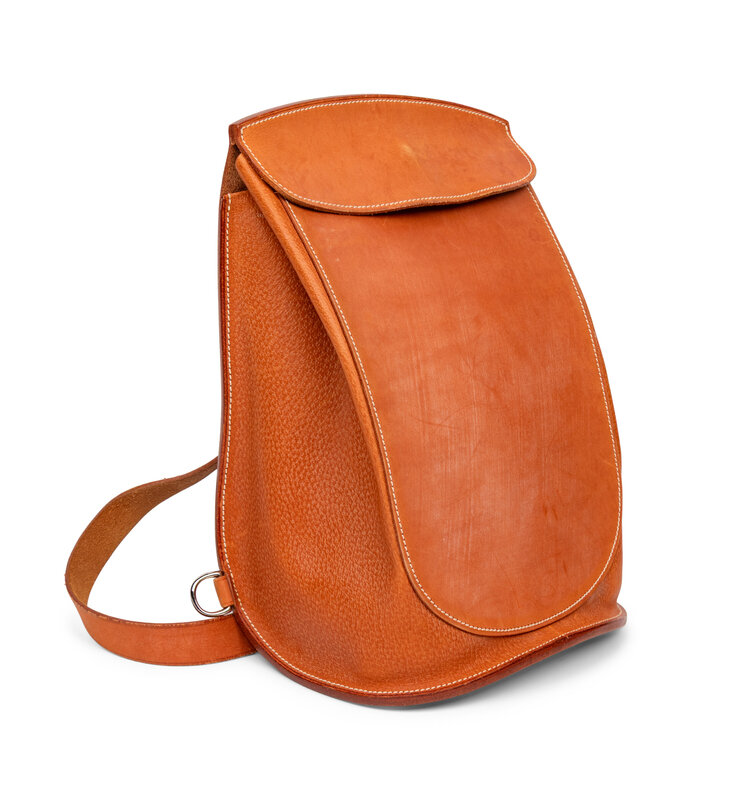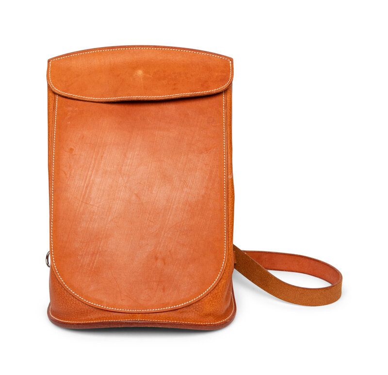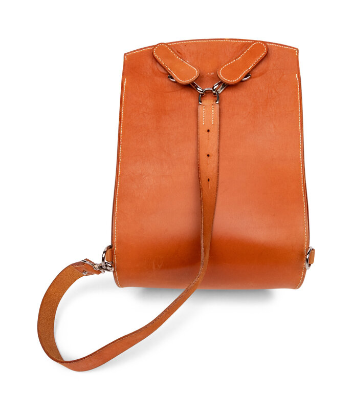 Sacoche pour Selle backpack bag in Fauve Barenia & Peau Porc leathers with palladium hardware. Clou de Selle snap closure at interior and single leather strap.
