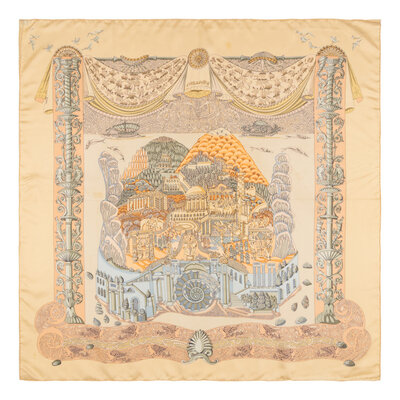 “L'Atlandtide” Scarf 90 in printed silk twill. Features rolled and hand-stitched edges. Includes box.