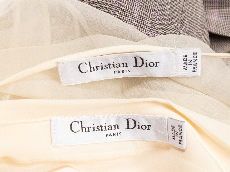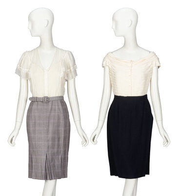 Sheath dress with a bodice in cream silk chiffon with lace insets, and a skirt in grey wool Glen plaid. Collarless V neckline. Layered short flutter sleeves. Pintucks & lace trim/insets throughout bodice; button closures at front of bodice. With attached half-slip at interior. Thread belt loops at waist with matching removable wool & leather belt.