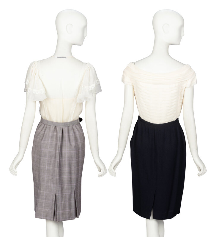 Sheath dress with bodice in cream silk crêpe de chine with a skirt in black acetate/viscose-blend crêpe. Wide bateau neckline. Cap sleeves. Knife pleats throughout bodice. Button closures at front. Knee-length pencil skirt with a kick pleat at center back hem. Invisible zipper closure at side bodice. Fully lined.
