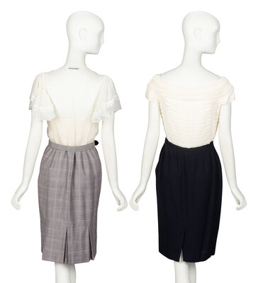Knee-length pencil skirt with box pleats at hem. Invisible zipper closure at side bodice/waist. Fully lined.