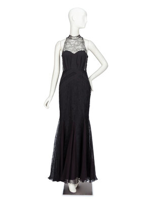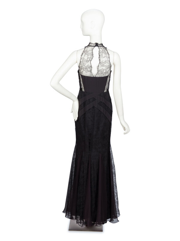 Sleeveless evening gown in black Chantilly lace with black silk crêpe & chiffon panels. Halter neckline in Chantilly lace with sweetheart neckline at bust. Full-length fishtail skirt with godets at hem. Thirty fabric covered button-and-loop closures at side bodice; three fabric covered button closures at back neck. Fully lined.