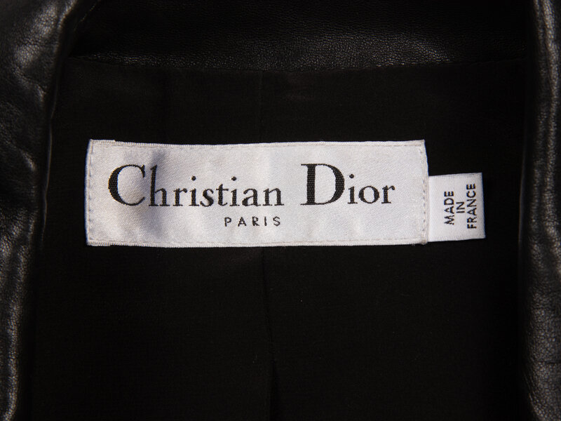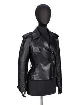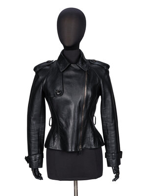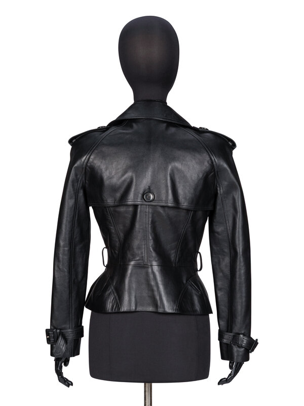 Fitted moto jacket in black lambskin leather. Spread collar & notched lapels/convertible collar. Buttoned epaulettes at shoulders. Buttoned storm flap at front chest; buttoned yoke at upper back. Full-length raglan sleeves with adjustable belts at sleeve hems. Hourglass silhouette bodice with flare at hips. Belt loops at waist; no belt. Asymmetric double-ended zipper closure at front. Fully lined.