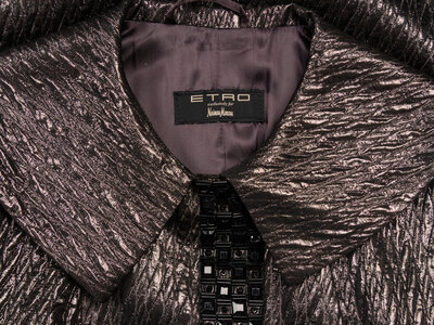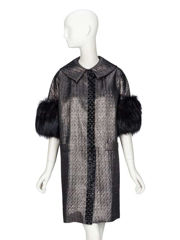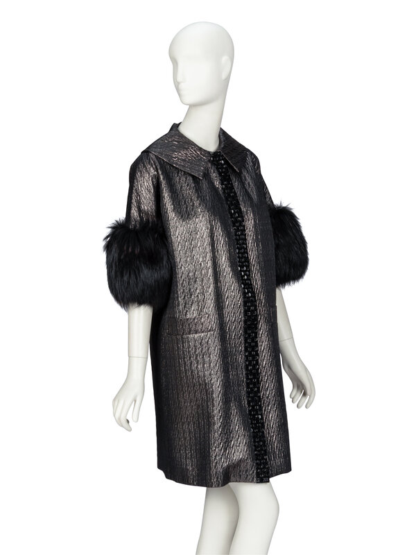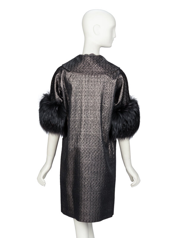 Knee-length evening coat in metallic pewter brocade with black bead & sequin embellishments at front. Round pilgrim collar. Elbow-length raglan sleeves with black tanuki fur trim at sleeve hems. Two welt pockets at front. Concealed snap button closures at front. Fully lined.