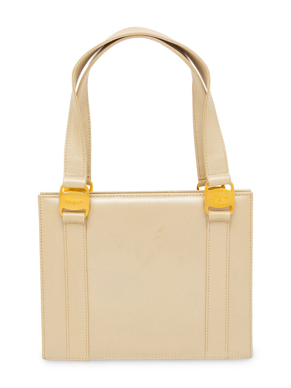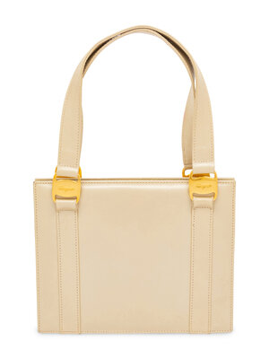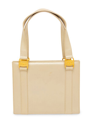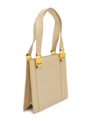 Handbag in pearlescent taupe leather with gold-tone hardware. Magnetic snap closure and flat leather handles.