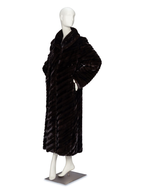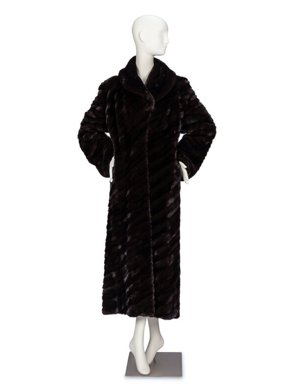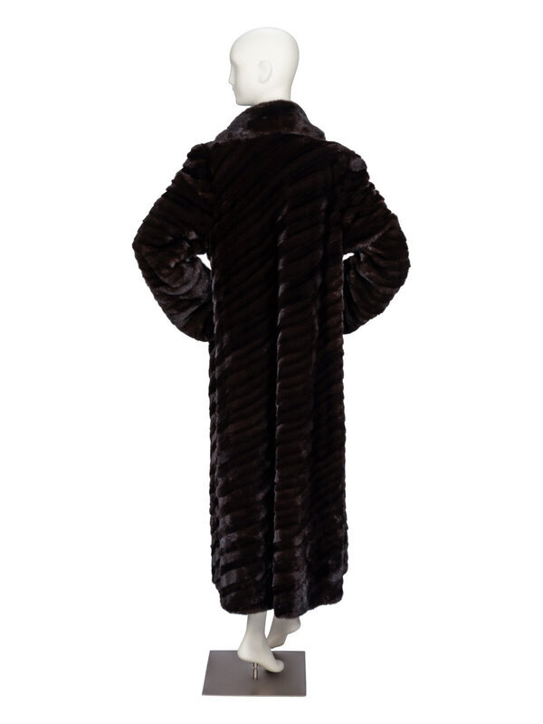 Ankle-length coat in diagonally strip-pieced dark brown ranch mink fur. Shawl collar. Full-length sleeves. Two vertical slit pockets at front; one slit pocket at interior. Four hook-and-eye closures at front. Fully lined.