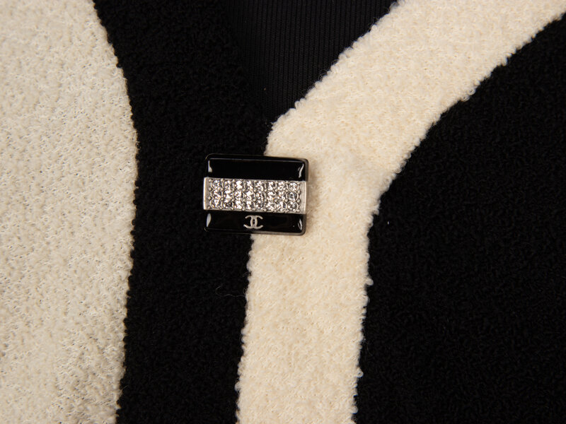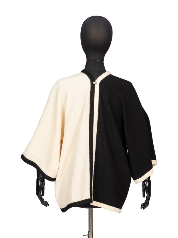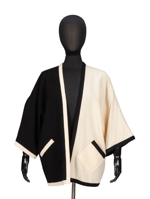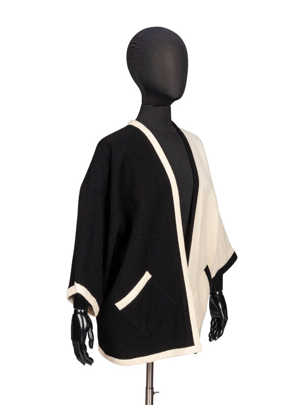 Kimono-style jacket in black & cream wool-blend bouclé crêpe. Open front. Incorporated elbow-length kimono sleeves. Two patch pockets at front. Contrast band edging throughout. Unlined.