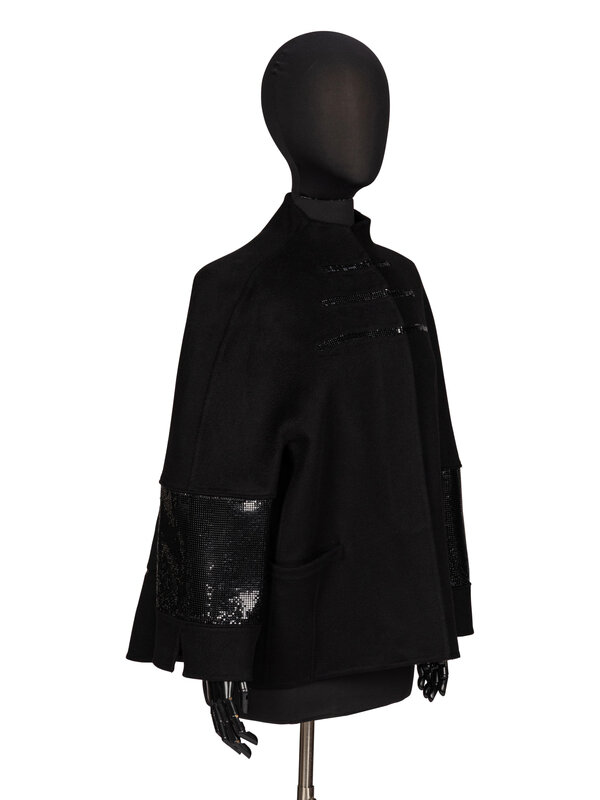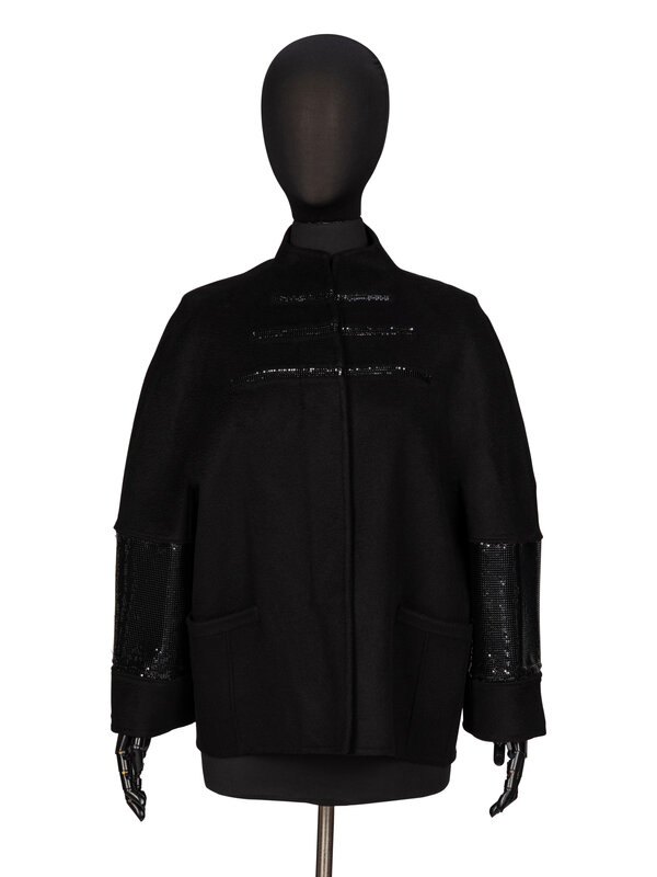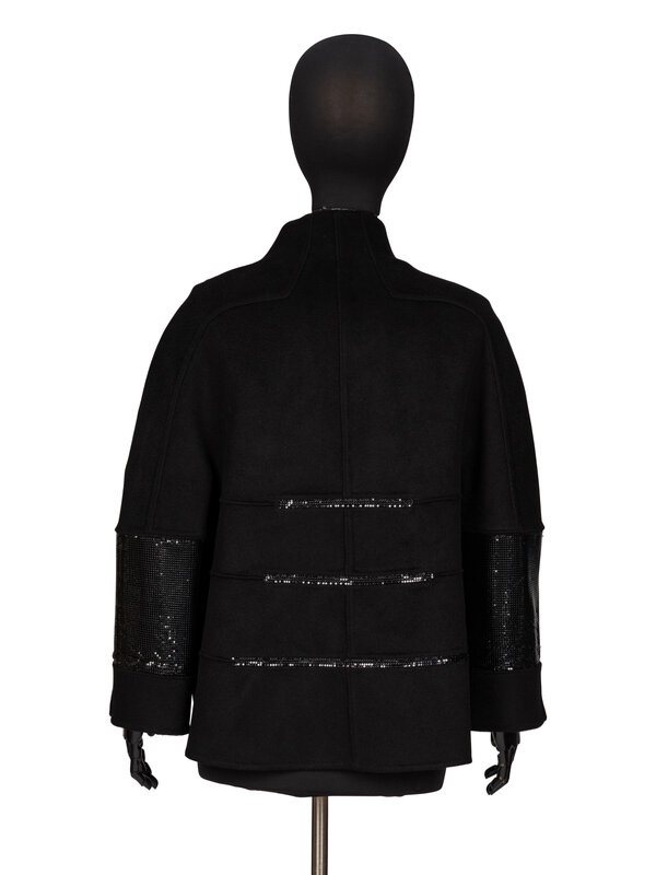 Short swing jacket in black double-faced cashmere; features black metal mesh inset panels at sleeves, upper chest, and at back. Built-up stand collar/neckline. Kimono-style incorporated three quarter-length sleeves. Two welt pockets at front. Concealed button closures at front. Self-lined.