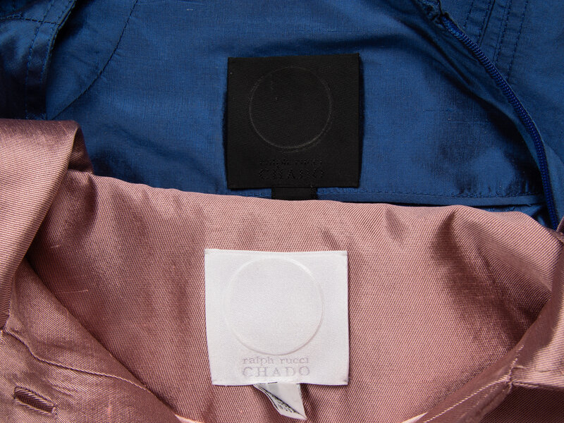 Blouse in sapphire blue silk shantung. Incorporated stand collar with short slit at front. Three-quarter-length bell-shaped raglan sleeves. Two welt pockets at front. Diagonal invisible zipper closure at back neck/shoulder. Unlined.