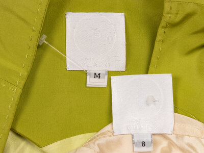 Short swing jacket in pea green silk faille. Decorative piecing & topstitching throughout. Built-up stand collar. Incorporated three-quarter-length kimono-style sleeves. Two welt pockets at front. Concealed button closures at front. Fully lined.
