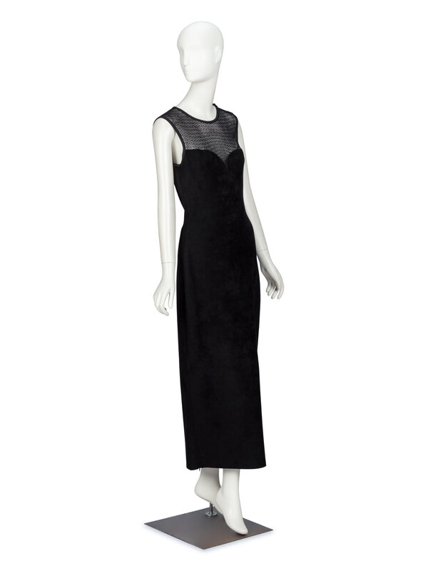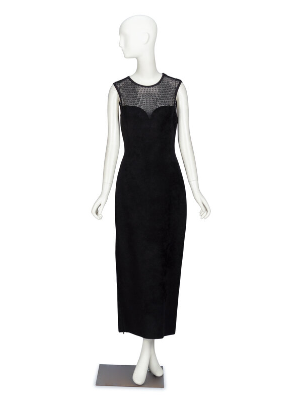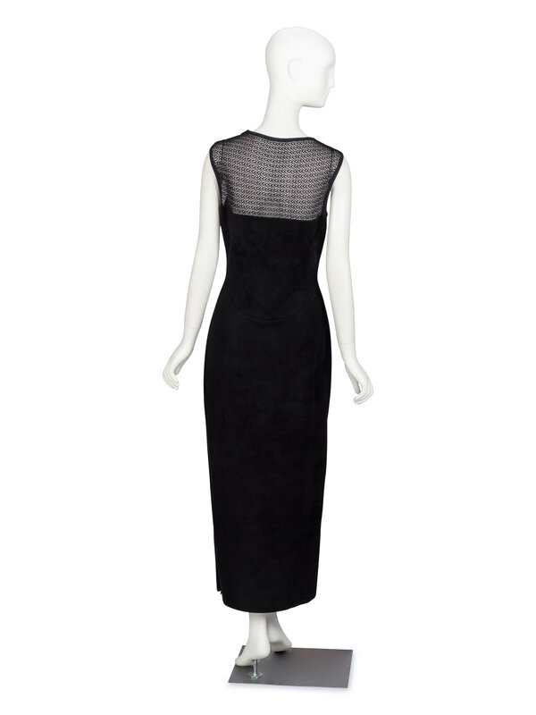 Sleeveless dress in black stretch-blend velvet fleece with a knit black panel at upper chest/back. Round collarless neckline. Sweethearth neckline. Fitted/bodycon silhouette. Invisible zipper closures at left shoulder seam, side bodice, and side seams at hem. Unlined.