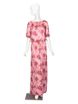 Full-length maxi dress in pink floral-print silk jersey; moderate stretch content. Wide bateau neckline with elasticated collar. Elbow-length sleeves with elasticated cuffs. Blouson-style bodice with shirring at waist & hips. Full-length straight skirt. No closures; unlined. Created in Abraham fabric.