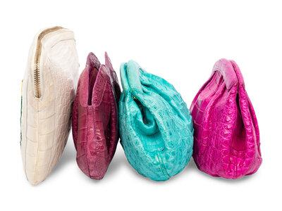 Clutch bag in purple crocodile skin. Magnetic snap closure.