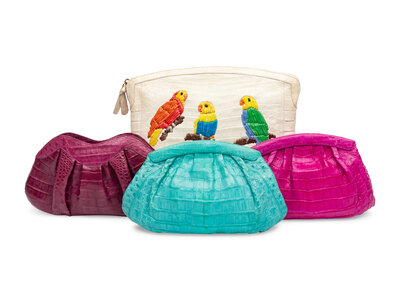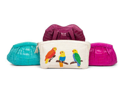 Clutch bag in cream crocodile skin with multicolor crocodile-embroidered parrot details. Zipper closure.