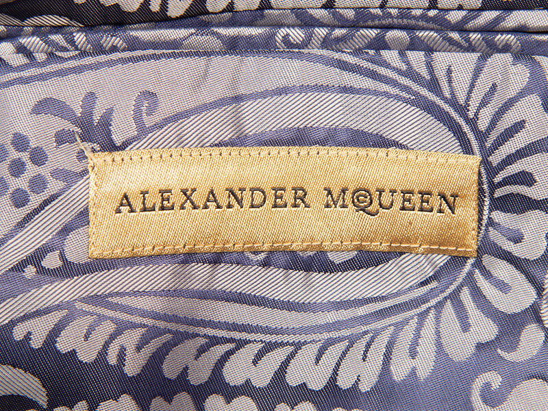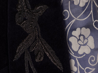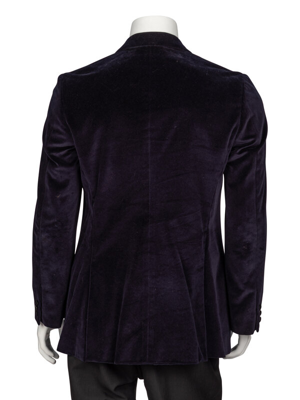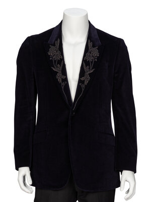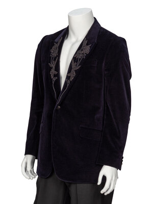 Tailored blazer jacket in midnight blue cotton velvet with tonal metallic embroidery at lapels. Notched & peaked lapels. Light padding at shoulders. Full-length set-in sleeves with decorative buttons at sleeve hems. Two besom pockets with flaps at front; one upper chest welt pocket. Three interior welt pockets. Single breasted; single fabric-covered button closure at front. Fully lined.