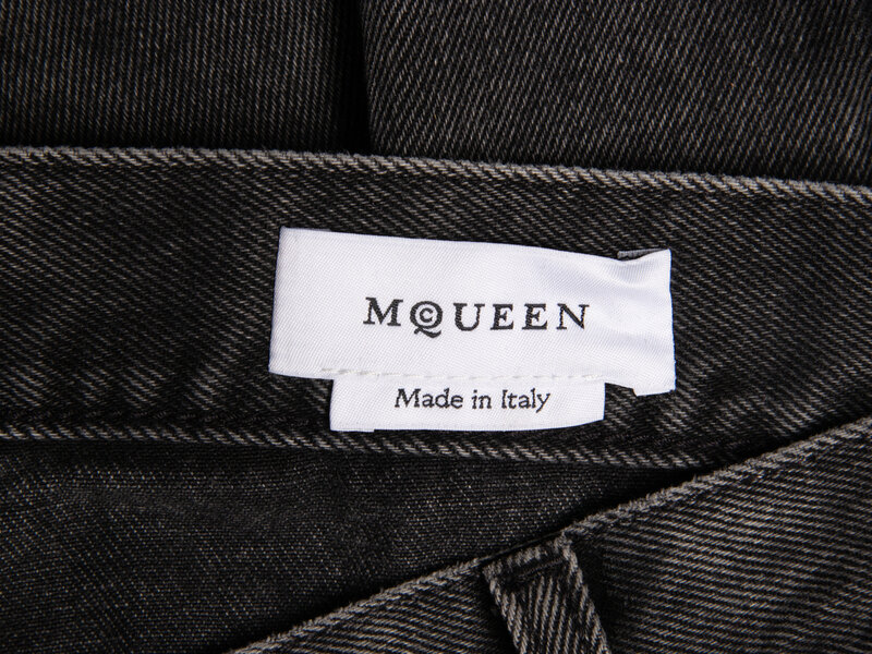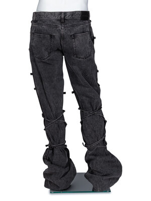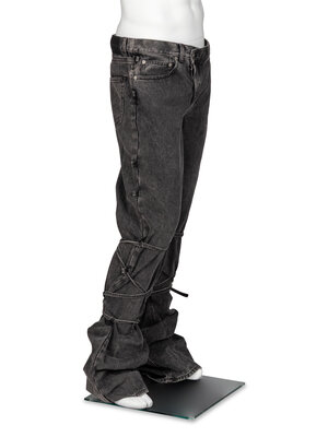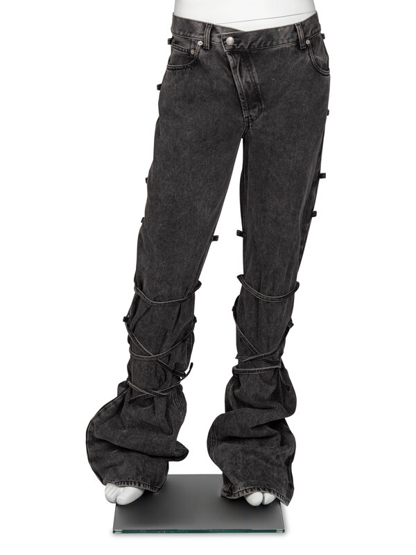 Men's/unisex "bondage" jeans in a grey stonewashed cotton denim. Straight legs. Features loops at side seams of jeans & self-fabric ties to tie around legs. Off-center asymmetric button and button fly closures at front waist. Two hip pockets at front; two patch pockets at back. Belt loops at waist.