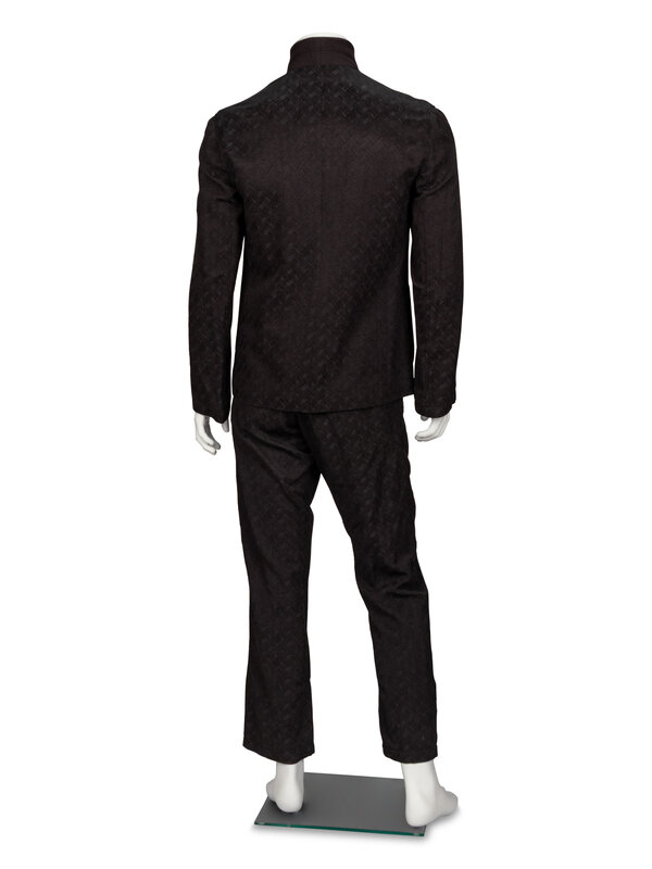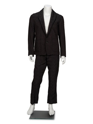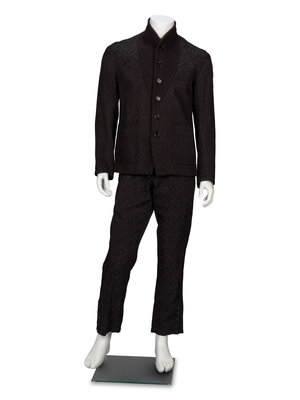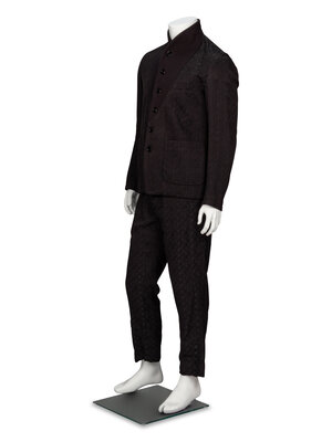 Lightweight jacket in black cotton/silk-blend textured jacquard. Shawl collar with a quilted black cotton twill reverse; convertible into stand collar. Full-length set-in sleeves. Two patch pockets at front; one upper chest welt pocket. One interior welt pocket. Single breasted; six button closures. Fully lined.