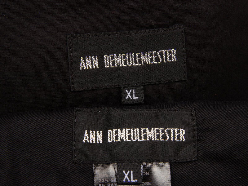 Straight-leg trousers in black cotton/silk-blend textured jacquard. Wide waistband in quilted black cotton twill; belt loops at waist. Two welt pockets at front; two welt pockets at back. Five button closures at front pant hems. Two button and fly zipper closures at front waist. Unlined.