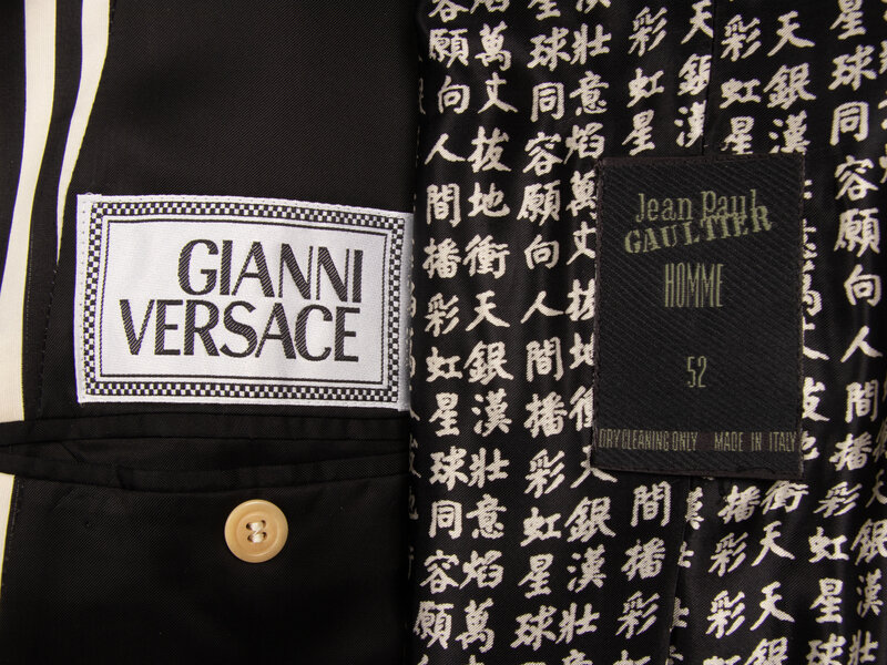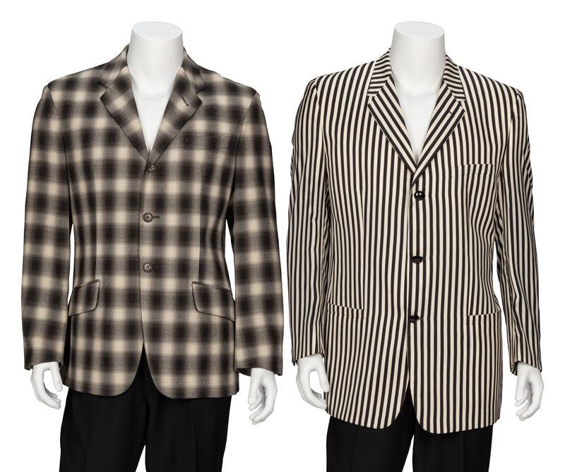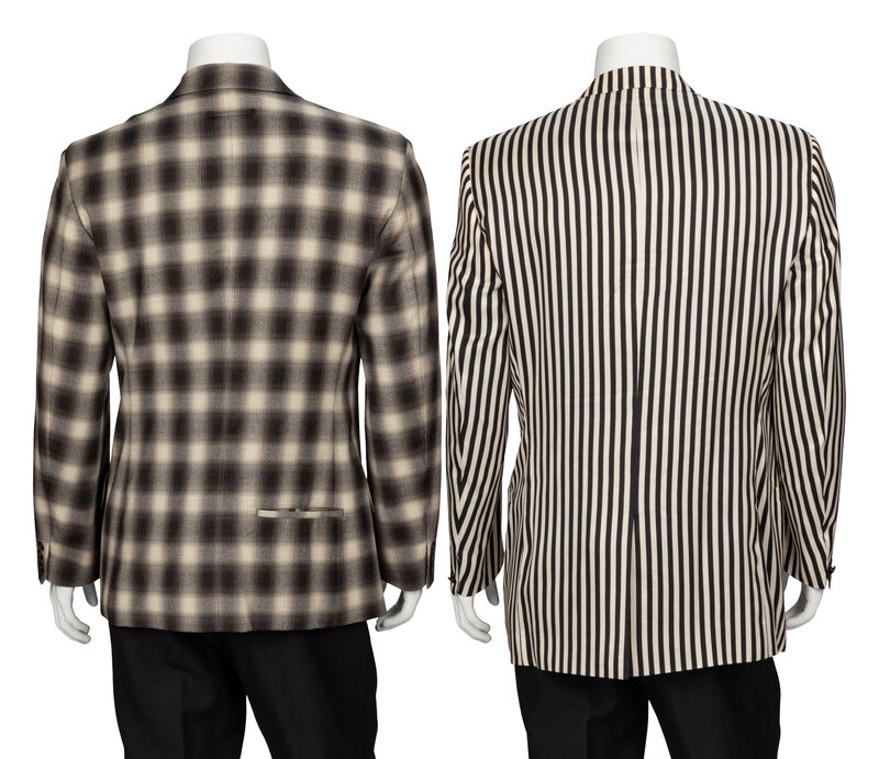 Tailored jacket in black & white-striped silk suiting. Notched lapels. Padding at shoulders. Full-length set-in sleeves with a single decorative button at cuffs. Two welt pockets at front; one upper chest welt pocket. Two interior welt pockets. Single breasted; three button closures at front. Fully lined.