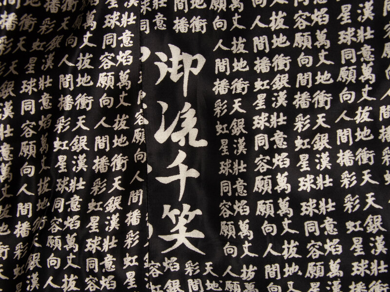 Tailored jacket in black & cream blurred-effect wool plaid. Notched lapels. Padding at shoulders. Full-length set-in sleeves with decorative buttons at sleeve hems. Two patch pockets with flaps at front; one welt pocket at upper chest, one mini welt pocket at lower back. One interior welt pocket. Single breasted; three button closures at front. Fully lined in a Chinese character-print satin.
