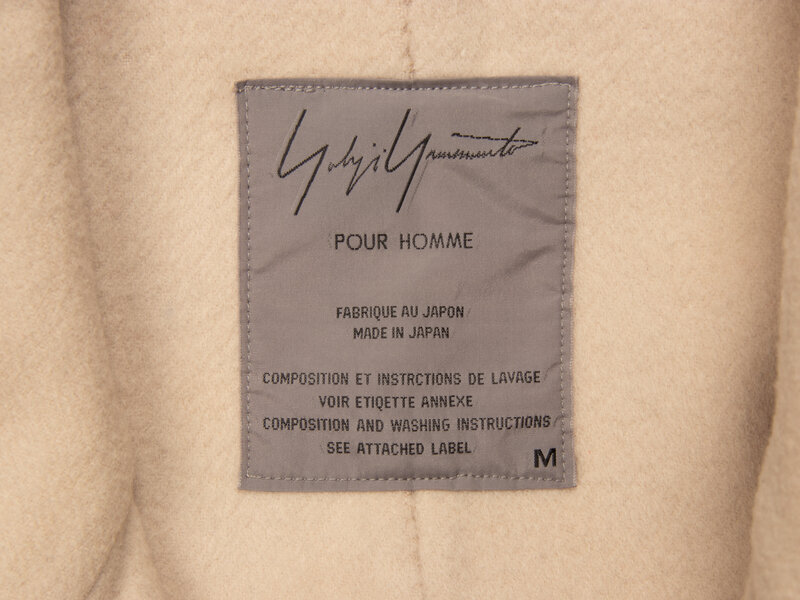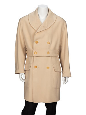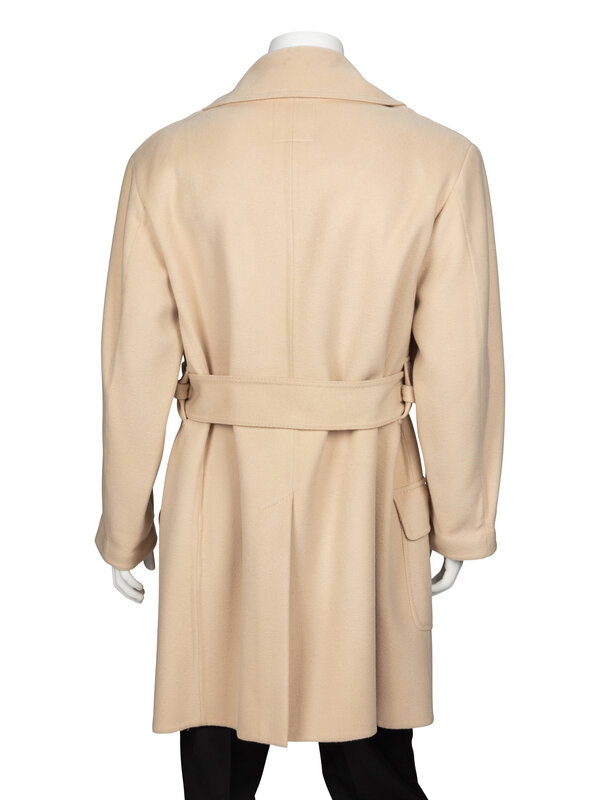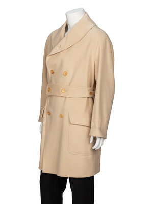 Car coat in cream wool-blend double-faced coating. Shawl collar. Light padding at shoulders. Drop shoulders; full-length set-in sleeves. Two patch pockets with flaps at front. Kick pleat at center back hem. Double breasted; three button closures at front. With removable self-fabric belt with button closures. Unlined.