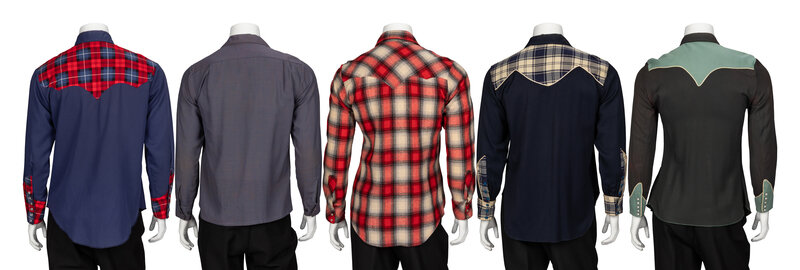 Western-style shirt in a blue cotton twill with contrasting red & blue plaid yoke & cuffs. Features patch pockets and snap button closures.