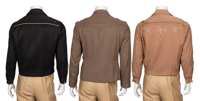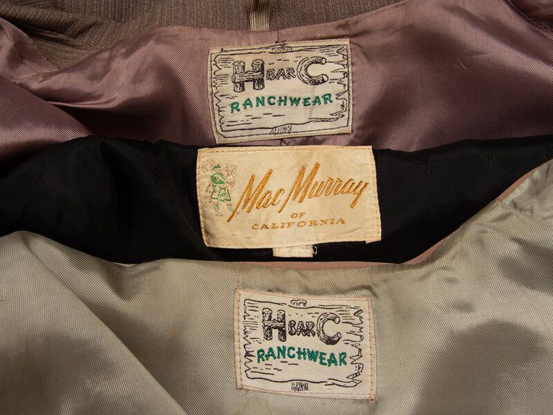 Cropped jacket in light brown wool gabardine with embroidery and black & white ribbon trim throughout. Spread collar. Full length sleeves with snap closure cuffs. Two vertical welt pockets at front. Snap closures at front. Fully lined.