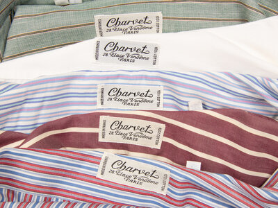 Button-up shirt in a pale blue/multicolor striped cotton poplin.