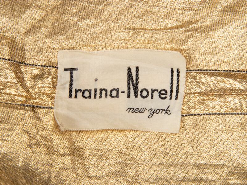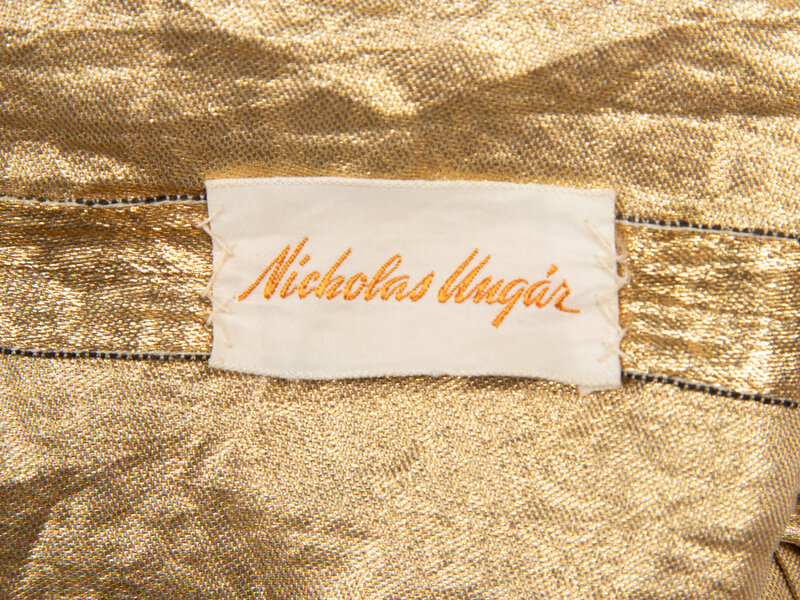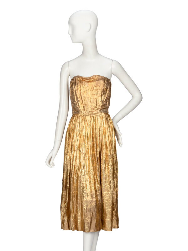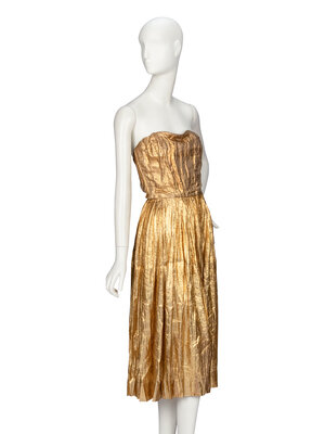 Strapless cocktail dress in metallic gold lamé. Sweetheart neckline with boned, fitted bodice; interior waistband closure. Knee-length pleated skirt. Zipper closure at back. Partially lined.