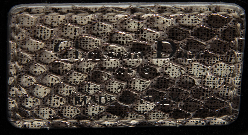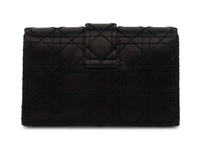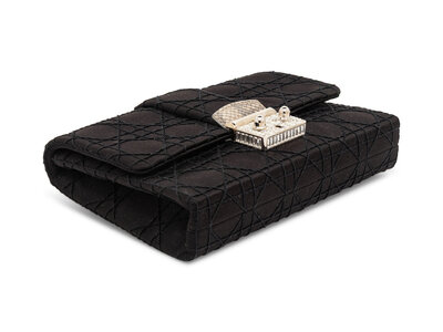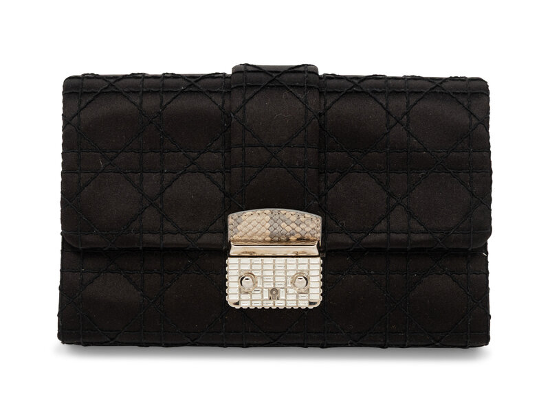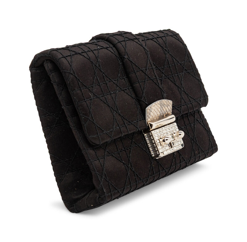 New Lock Clutch bag in black satin with Cannage topstitching details and metallic snakeskin trim. Pavé rhinestone embellished push-lock closure.