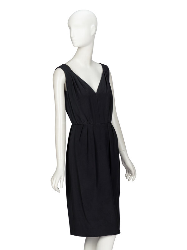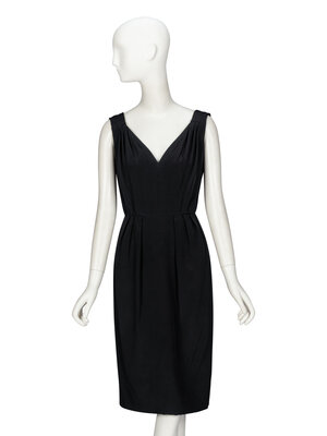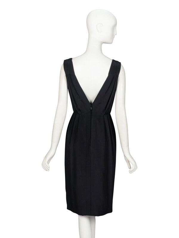 Cocktail dress in black silk crêpe de chine. V-neckline with pleats at bodice. Knee-length pencil skirt with pleats at waistline. Zipper closure at back bodice. Fully lined.