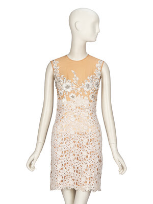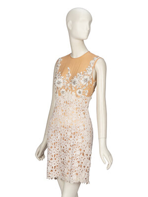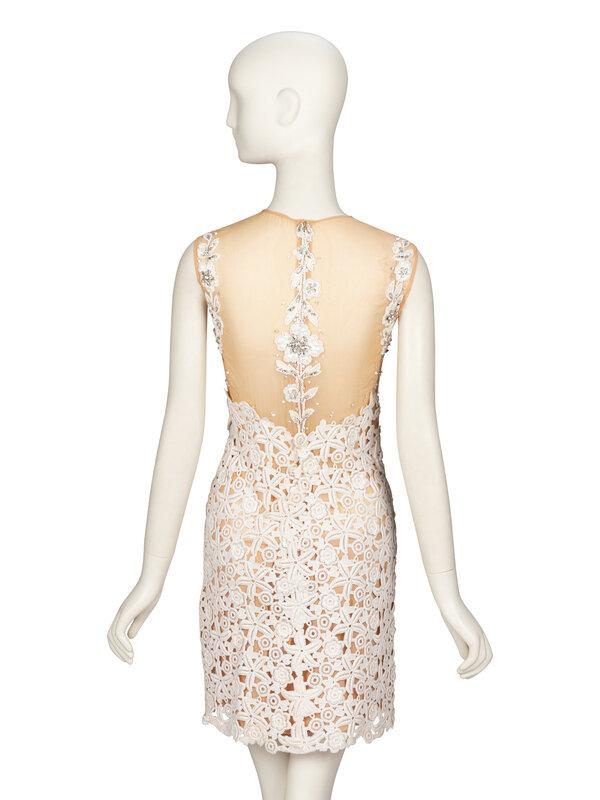 Sleeveless cocktail minidress in beige silk chiffon with cream lace, white bead, and rhinestone embellishments. Round neckline. Fitted bodice & waist; mid-thigh length straight skirt. Zipper closure at back; snap closures to lace overlay at back waist. Fully lined.