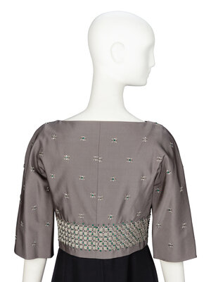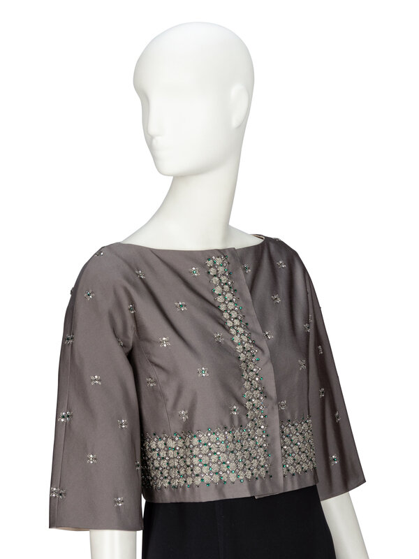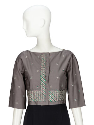 Cropped evening jacket in grey wool-blend shot silk with all-over metallic embroidery & rhinestone embellishments. Wide bateau neckline. Elbow-length incorporated sleeves. Fabric-covered snap closures at front. Fully lined in cream silk charmeuse.
